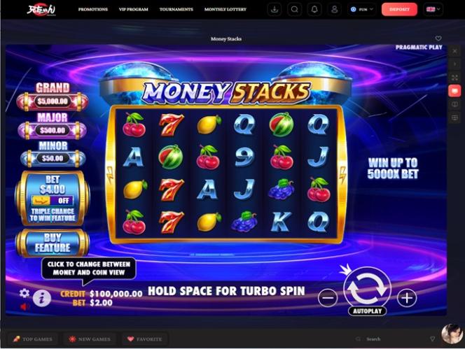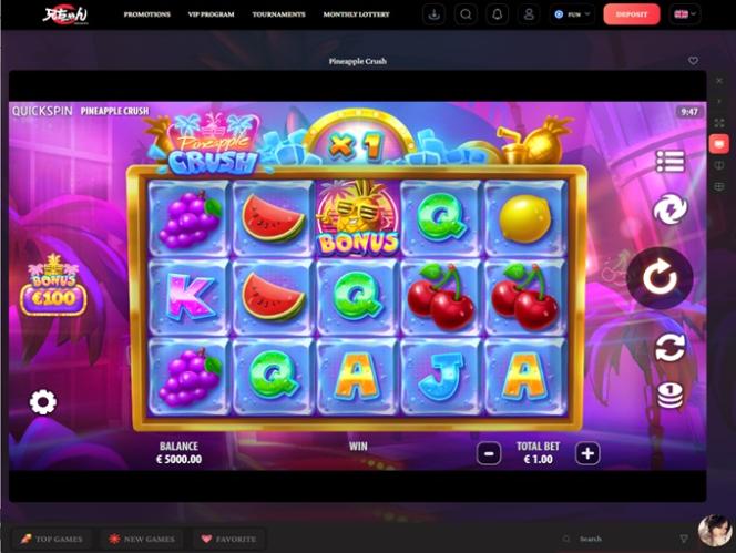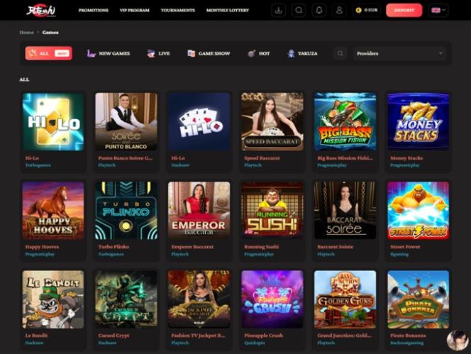 さらに、ウェブサイトの上部には、すべてのゲーム、プロモーション、トーナメント、VIP プログラム、毎月の宝くじにアクセスできる水平メニューがあります。
