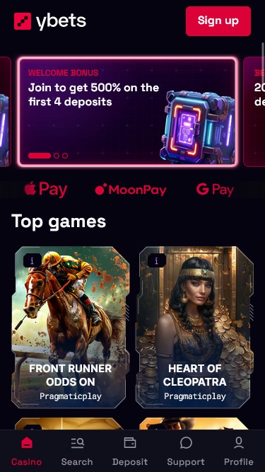 プレイヤーがホームページにアクセスすると、すぐにウェブサイト最大のプロモーション(ウェルカムパッケージ、キャッシュバック、Engine of Fortuneシステムなど)を紹介する広告が表示されます。また、いくつかの決済方法や、プラットフォーム上で最も人気のある最新ゲームについても調べることができます。