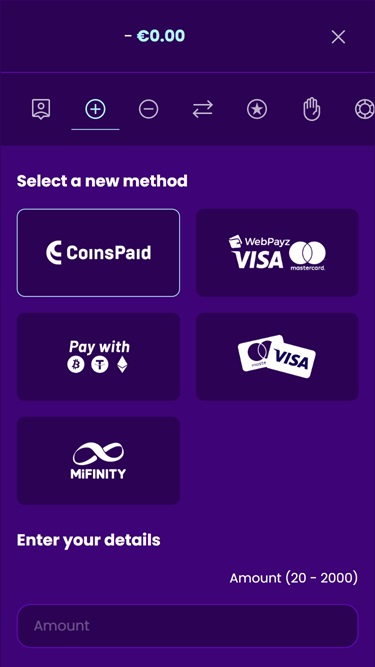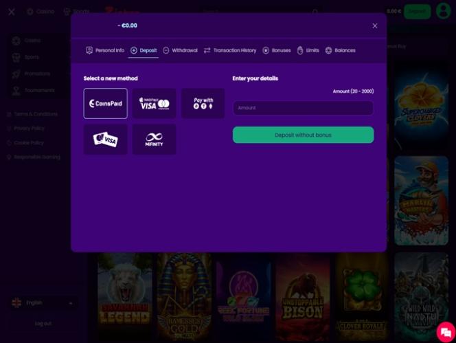 インターフェースはユーザーフレンドリーで、マルチプラットフォームに最適化されています。登録プロセスは非常に簡単で、すべてのプレイヤーは、モダンで可愛らしいデザインの女性アバターがホストとして迎えてくれます。ロイヤルブルー、パープル、ターコイズの色合いを組み合わせた興味深いカラーパターンが、落ち着いた雰囲気とギャンブルへの期待感を演出しています。さあ、カジノロビーをチェックしてみましょう!
