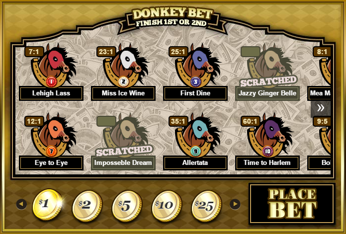 通常のレースの話に戻りますが、プレイヤーはレーシングフォームのように膨大な統計情報に圧倒されることはありません。実際、統計情報は一切表示されません。表示されるのは馬の名前と、各馬の「勝率」だけです。ラスベガスの昔ながらのダービー競馬ゲーム(MGMカジノとDカジノにはまだいくつか残っています)と同じくらいシンプルですが、賭け方の種類が豊富という点が異なります。より本格的なベッターは「レースプレビュー」をクリックすることで、競馬場からのライブフィードを見ることができます。そこには、様々なベッティングプール、出走取消馬、その他競馬ベッターが重視する情報も含まれています。