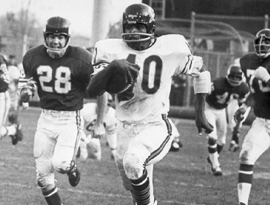 セイヤーズは1965年から1971年までの7シーズン、シカゴ・ベアーズでプレーしました。彼は、パワフルなタイトエンド「アイアン」マイク・ディトカや、 シカゴ・ベアーズの恐るべきラインバッカー、ディック・バトカスといった名だたるチームメイトと共にプレーしました。ゲイルは極めて俊敏で機敏、そして驚異的なダウンフィールドビジョンを持ち、相手ディフェンスがタックルで倒すのが非常に困難でした。その俊敏で爆発的なランニングスタイルは、彼をNFL史上最高のランニングバック、そしてキック&パント・リターナーの一人へと押し上げました。