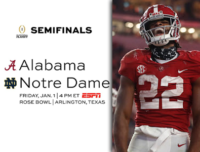 2020年のNCAAカレッジフットボールプレーオフ準決勝は元旦に開幕し、世界ランキング1位のアラバマ大学クリムゾンタイドと世界ランキング4位のノートルダム大学ファイティングアイリッシュがローズボウルで対戦します。この試合の勝者はNCAAカレッジフットボールプレーオフ全国選手権に進出し、2021年1月11日(月)にマイアミで行われるCFP準決勝のもう1試合、オハイオ州立大学バックアイズとクレムソン大学タイガースの勝者と対戦します。