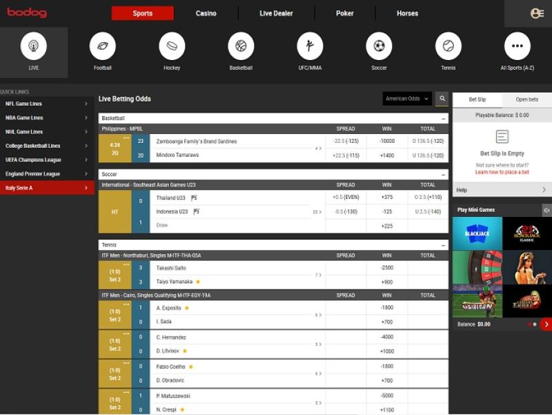 Bodogは、幅広いスポーツに賭けることができ、各スポーツごとに幅広い賭け条件を提供しています。対象となるスポーツには、ライブ、アメリカンフットボール、バスケットボール、アイスホッケー、サッカー、UFC、総合格闘技(MMA)、テニス、バドミントン、野球、ボクシング、クリケット、サイクリング、ダーツ、エンターテイメント、eスポーツ、フットサル、ゴルフ、ハンドボール、競馬、モータースポーツ、ナンバーズゲーム、オリンピック、その他のスポーツ、政治、ラグビーリーグ、ラグビーユニオン、スヌーカー、卓球、バーチャルスポーツ、バレーボール、冬季オリンピック、ウィンタースポーツなどがあります。