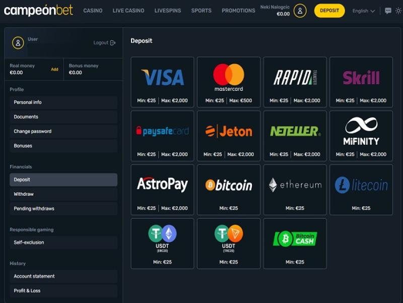 入金方法: Visa、Sepa、Neteller、Skrill、Jeton Wallet、Pay Safe Card、Eco Payz、i-Deal、Giro Pay、Much Better、Neo Surf、Safe Charge、E-Pro、E-Voucher、Mi Finity、Rapid Transfer、Bitcoin Cash、Bitcoin、Ethereum、Litecoin。