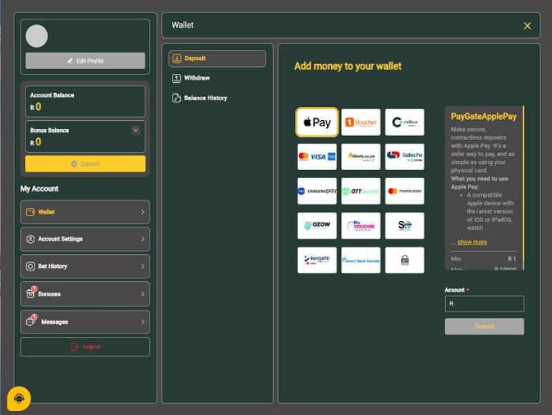 このオンラインスポーツブックとカジノが提供する大きなメリットの一つは、非常に幅広い決済オプションです。南アフリカ在住の方は、地元のGbetsベッティングショップに立ち寄ってオンラインアカウントに資金を入金することもできます。