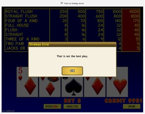 ゲームインターフェースのすぐ上にある「戦略エラーを警告」ボックスを有効にすると、より良い動きが見られるたびにポップアップウィンドウが表示されます。この機能は、オールアメリカンポーカーだけでなく、ポーカー全般のルールを学ぶのに役立ちます。