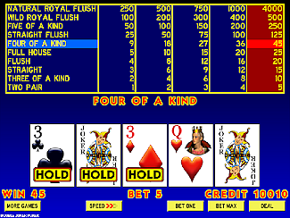 (この点を証明するために、テスト実行のスクリーンショットでわかるように、最初は 1 つのペア (配当表にも載っていないハンド) とジョーカー (スリー オブ カインドに十分な) があり、2 つ目のジョーカーのためにドローが提供され、フォー オブ カインドになりました。)