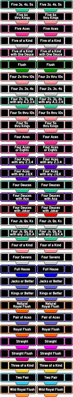 したがって、ディーラーに勝つために単一のデッキから配られた強力なカードを保持して可能な限り最高のハンドを構成するという伝統的なポーカーの目標を達成する可能性は、最下位のフォーオブアカインドでストレートフラッシュと同額の配当が得られる(残りの6つのオプションではさらに高い配当が得られる)という独特の配当表によって増加します。