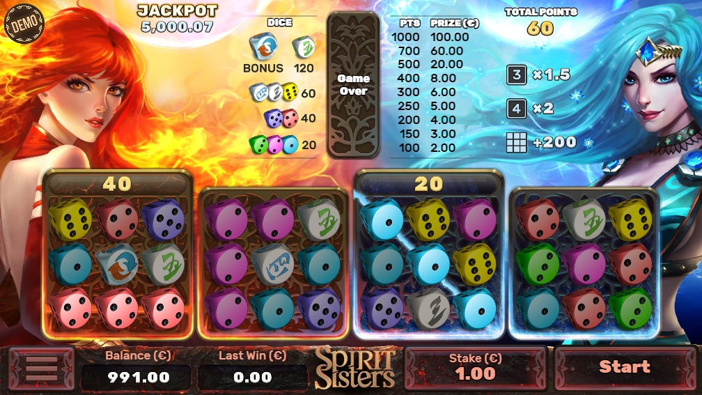 スピリット シスターズは非常にユニークなゲームです。4 つの 3x3 フレームを使用します。一度に 1 つずつ、プレイヤーに 3 つのサイコロの縦のスタックが与えられます。プレイヤーは、4 つのフレームのどれにそれを置くかを選択できます。サイコロのスタックは、そのフレームの一番左の空いている列に置かれます。プレイヤーは、任意の行または対角線上に 3 つの同じサイコロを形成することでポイントを獲得します。勝敗は獲得したポイント数によって決まります。行または対角線上に 3 つのボーナス シンボルを獲得すると、ボーナス ゲームをプレイできます。