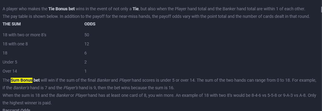 - 合計ボーナス: ? (ヘルプ ファイルには、プレーヤーとバンカーのハンド間のポイントの合計に基づいて支払われるこの賭けについて記載されていますが、テーブルのどこに賭けるかがわかりません。何らかの方法で、どこでも賭けることができると確信できたら、分析してみるつもりです。)