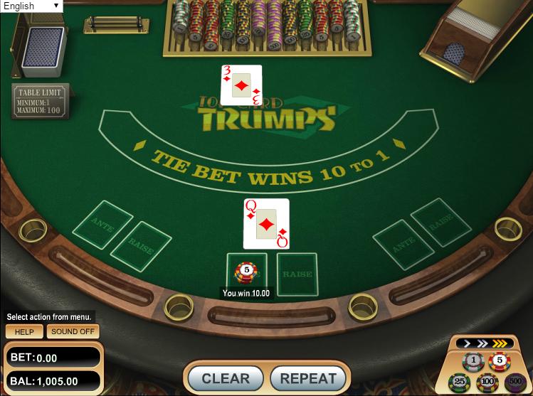Betsoft は、カジノ ウォーを Top Card Trumps と呼んでいます。6 つのデッキを使用し、引き分けが続くと「ボーナスなし」という厳しいルールが適用されます。これにより、ハウス エッジは 2.88% になります。