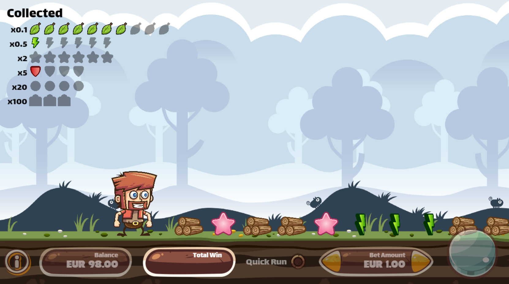 私の知る限り、Coin Runner は巧妙でユニークなゲームです。キャラクターが走りながら、通り過ぎるものをすべて集めるという点で、NES のスーパーマリオブラザーズを彷彿とさせます。プレイヤーが特定のシンボルを一定数以上集めると、ペイテーブルに従って賞金を獲得します。リターンに関する情報は提供されていません。