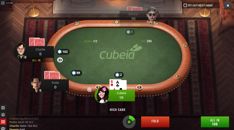 Cubeia の Web サイトには、同社が「オールインまたはフォールド」というタイトルのプレイヤー対プレイヤーのポーカー ゲームを提供していると記載されていますが、これは明らかにその通りです。「オールイン」ベットのみが許可され、すべてのベットはフロップ前に行われます。非常に興味深いです。これは数学的な分析が難しいものになるでしょう。