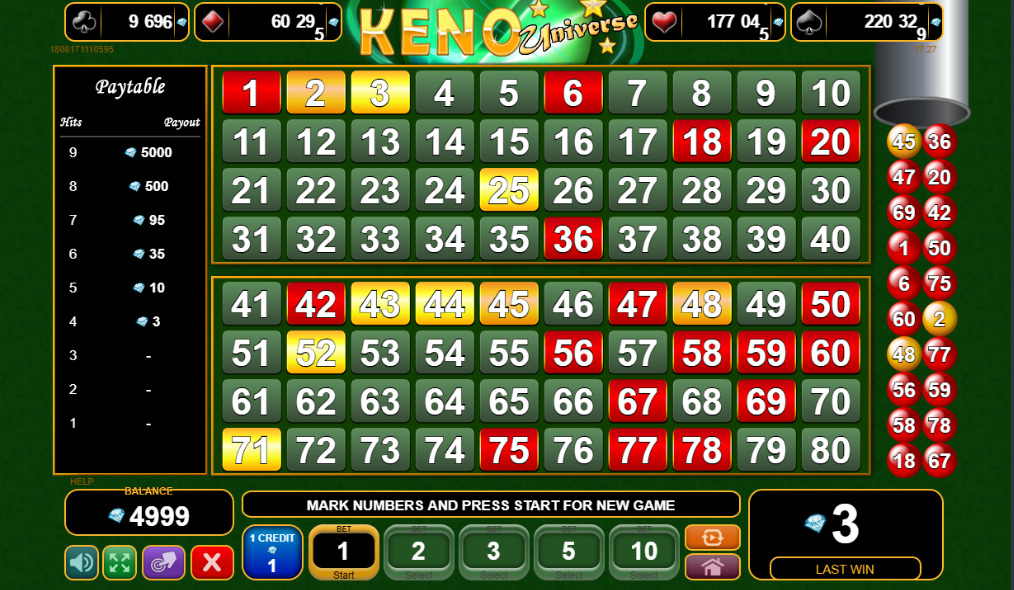 EGT キノ ゲームはシンプルで高速です。次の表は、ペイ テーブルとオッズを示しています。ピック 2 以外では、リターンは 94.15% から 94.48% (ピック 5) の狭い範囲にあります。