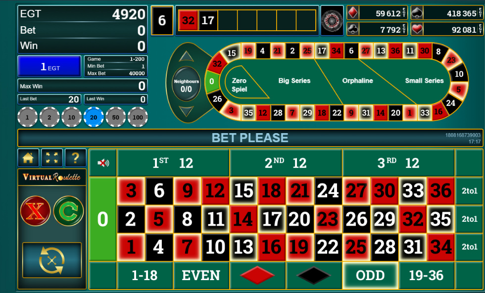 2 つのルーレット ゲームが提供されており、どちらもシングル ゼロです。仮想ルーレットは完全に電子化されています。ヨーロピアン ルーレット ゲームは実際のホイールに基づいており、スピン間の時間は指定されています。どちらのゲームもシンプルで高速です。両方のゲームで、すべての賭けのハウス エッジは 2.70% です。