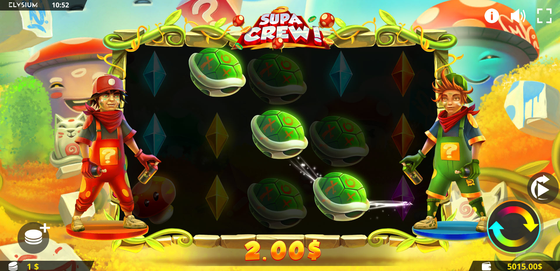 - Supa Crew — この 5 リールのゲームには、裏返すとランダムなシンボルが現れる「コイン」シンボルがたくさんあります。プレイヤーが 1 回のスピンで複数のコインを獲得した場合、それらはすべて同じものに裏返されます。また、画面上の 3x3 の正方形をコインで覆うスーパー コインもあります。さらに、ランダムな勝利を支払う 2x2 のマルチプライヤー シンボルもあります。最後に、一部の負けシンボルを勝ちシンボルに変える Supa Crew Bothers があります。