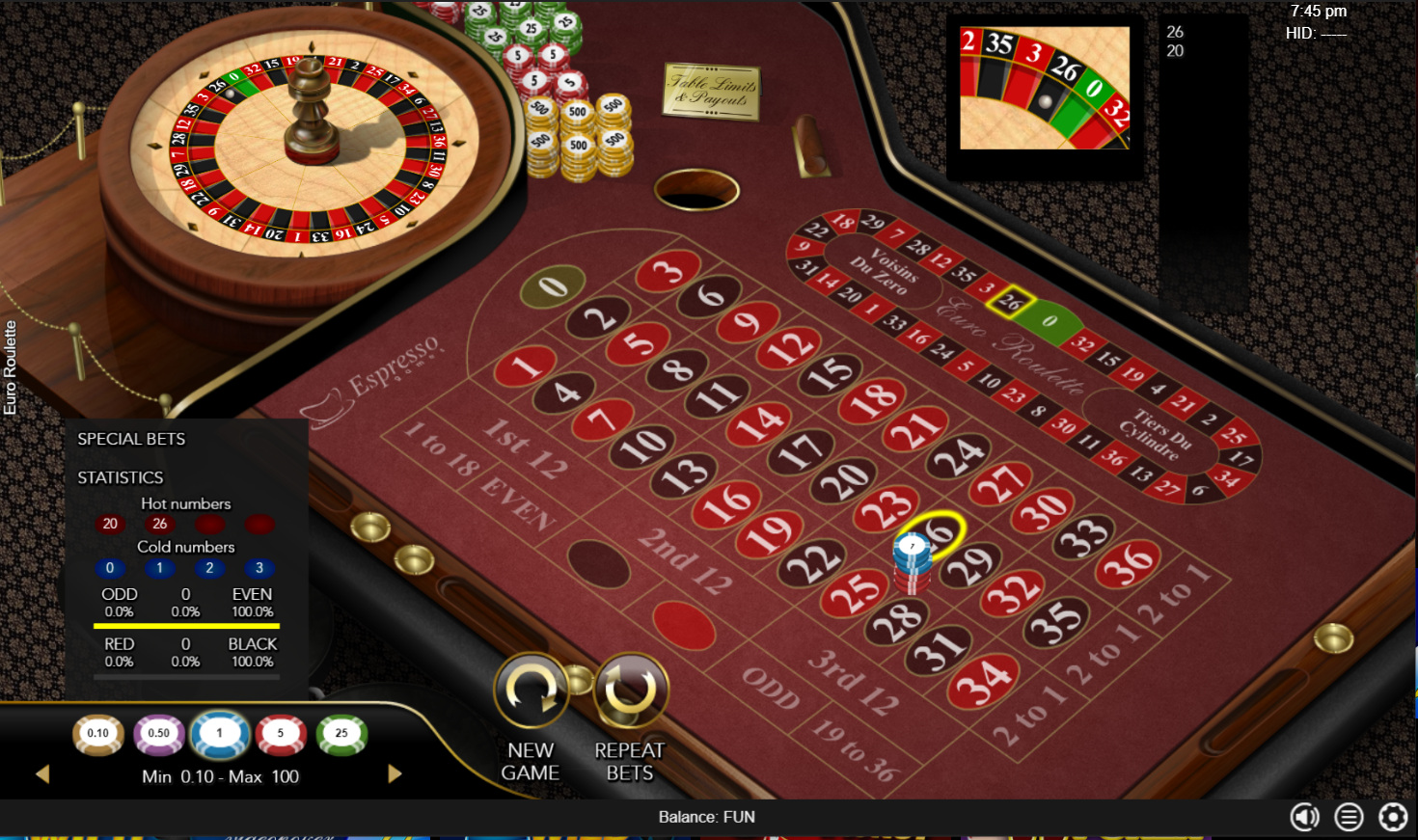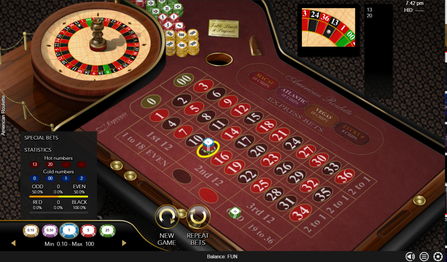 - ヨーロピアン ルーレット — これは私が「フレンチ ルーレット」と呼んでいるもので、ボールがゼロに落ちた場合、イーブン マネー ベットの半分が失われます。これにより、イーブン マネー ベットのハウス エッジは 1.35%、その他のすべてのハウス エッジは 2.70% になります。ルーレットはこれ以上に優れたものはなく、Espresso はこのような自由なルールを提供する数少ない場所の 1 つです。