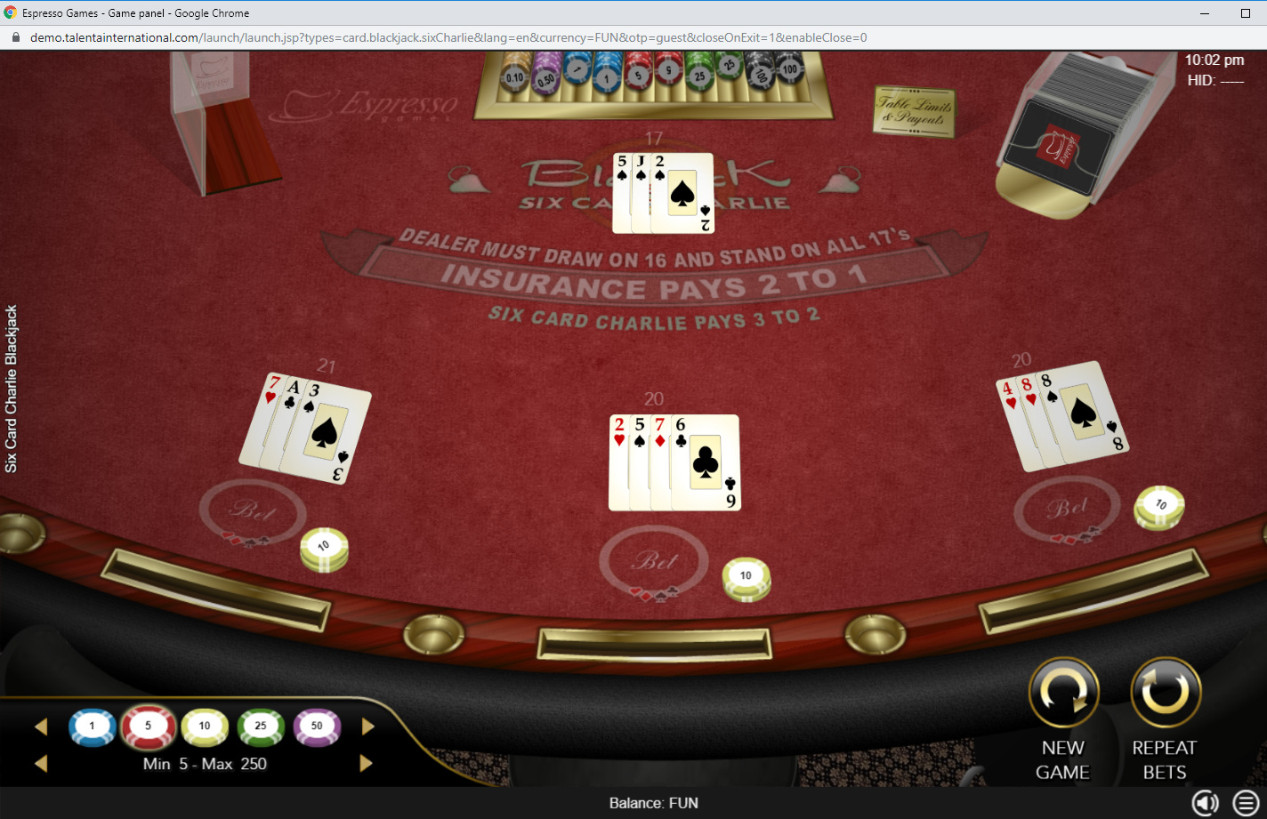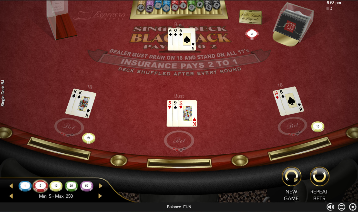 Espresso では、 Texas Hold 'Em ボーナスゲームを単に「Texas Hold 'Em」と呼んでいます。同社は、アンティの勝ちがストレートから始まるという、ラスベガスのリベラルなルールに従っています。このゲームのリスク要素は、予想損失と合計賭け金の比率として定義され、0.53% と低くなっています。