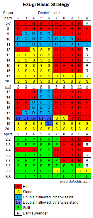 エースに対する早期降伏ルールにより、プレイヤーに 0.39% の利益がもたらされ、ハウスエッジは 0.11% と非常に低くなります。ヘルプ ファイルには、リターンが 99.50% であると誤って記載されています。基本戦略は次のとおりです。