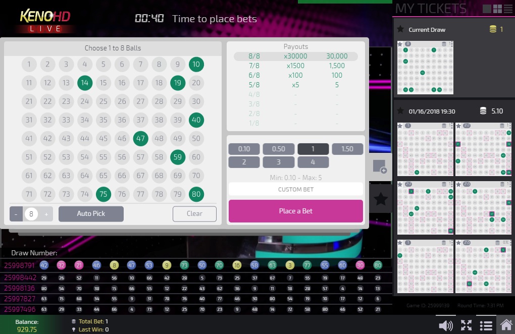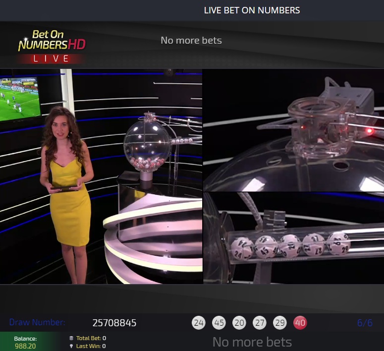 Bet on Numbers は、49 個のボールのうち 6 個のボールの抽選に賭けるさまざまな方法がある宝くじタイプのゲームです。ボールの抽選はライブ ディーラーによって 5 分ごとに行われます。すべてのルールとオッズについては、 Bet on Numbersのページをご覧ください。