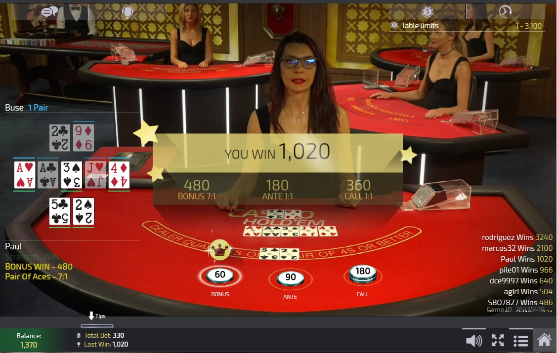 カジノ ホールデムは通常のルールで提供されます。アンティ ベットでは 100-20-10-3-2-1 のペイ テーブルに従い、ハウス エッジは 2.16% です。ボーナス ベットでは 100-50-40-30-7-7-7-7 のペイ テーブルに従い、ハウス エッジは 6.26% です。