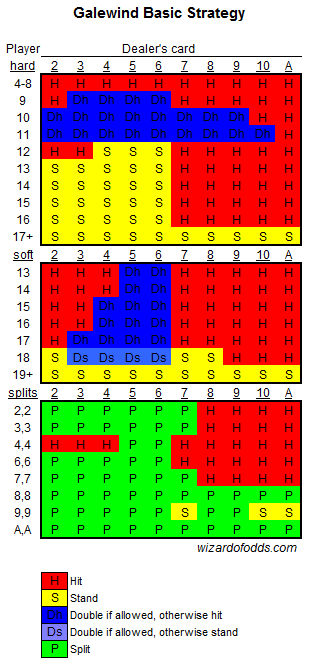 以下は、これらのルールの正しい基本戦略です。5 や 10 を分割しない、保険をかけないなどの明らかなプレイは省略されています。