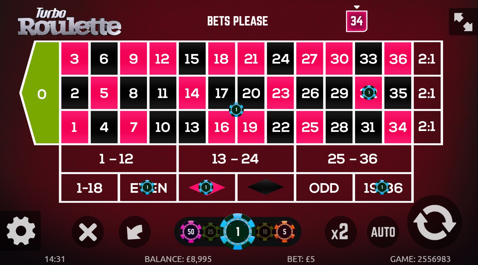 - ターボ ルーレット — シングル ゼロ ルーレットと同じですが、ホイールが止まるまで待つ必要がありません。ハウス エッジはすべての賭けで 2.70% です。