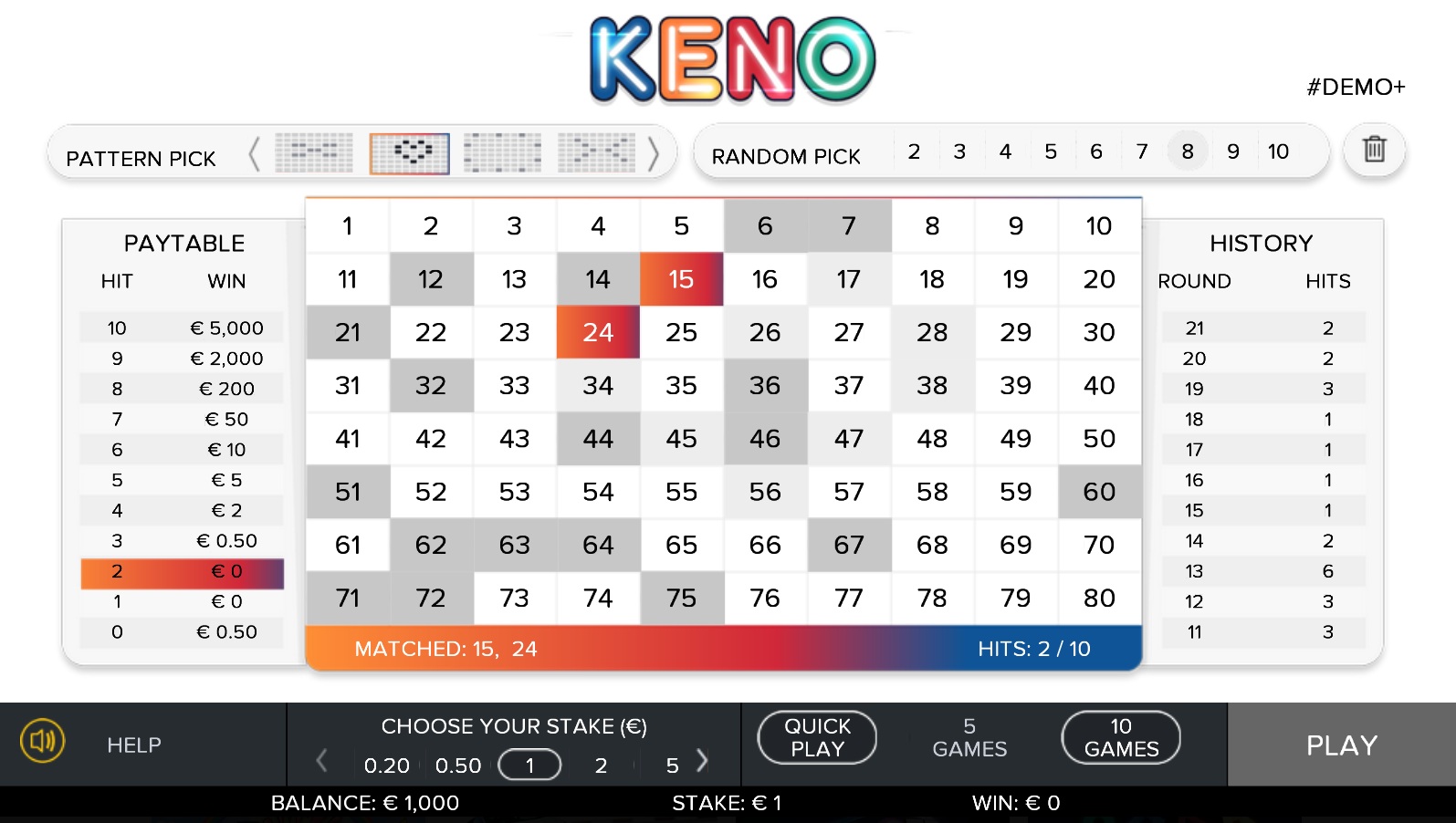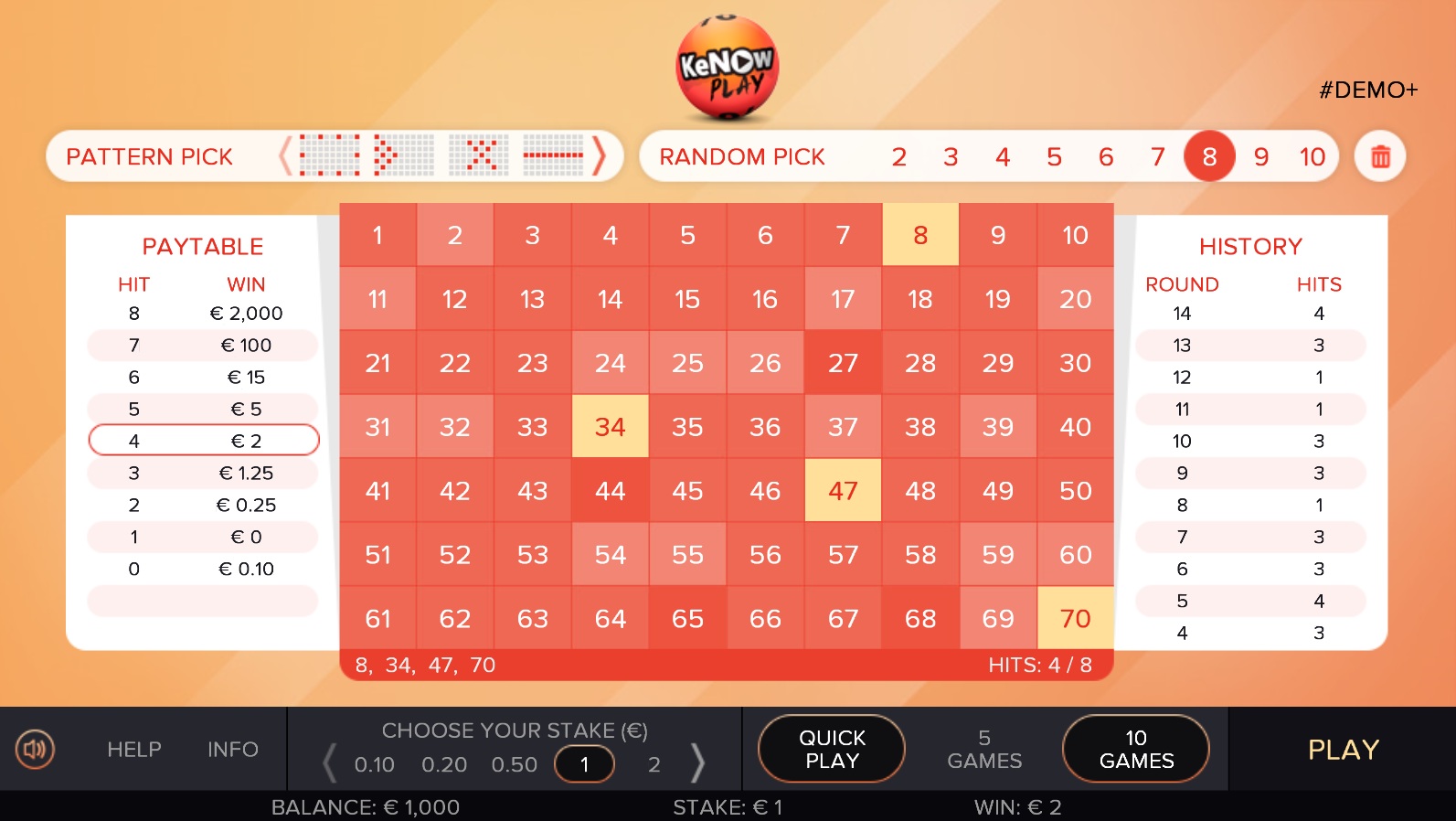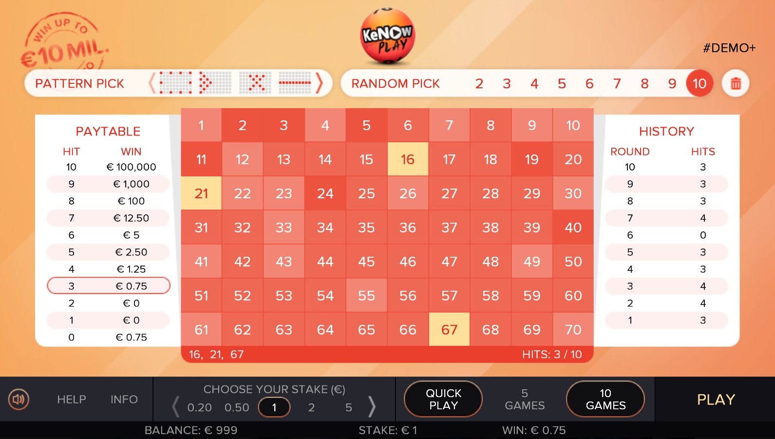 3 番目のゲームは KeNow のバージョンですが、ピック 10 のペイ テーブルが異なり、0.75 - 0 - 0 - 0.75 - 1.25 - 2.5 - 5 - 12.5 - 100 - 1000 - 100000 となります。このゲームのリターンは 65.60% で、まだひどいですが、少なくとも通常の KeNow の 56.12% よりは良いです。