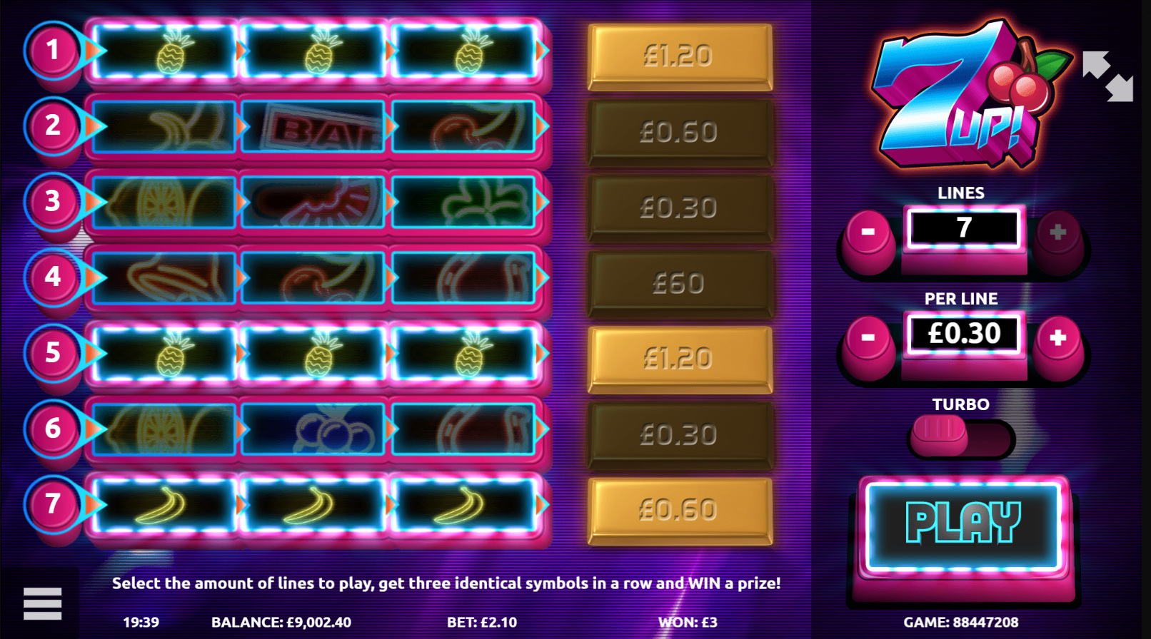 - 7 Up — これは基本的に 7 つの 3 リール ゲームを同時にプレイすることです。プレイヤーへのリターンは 92.09% です。