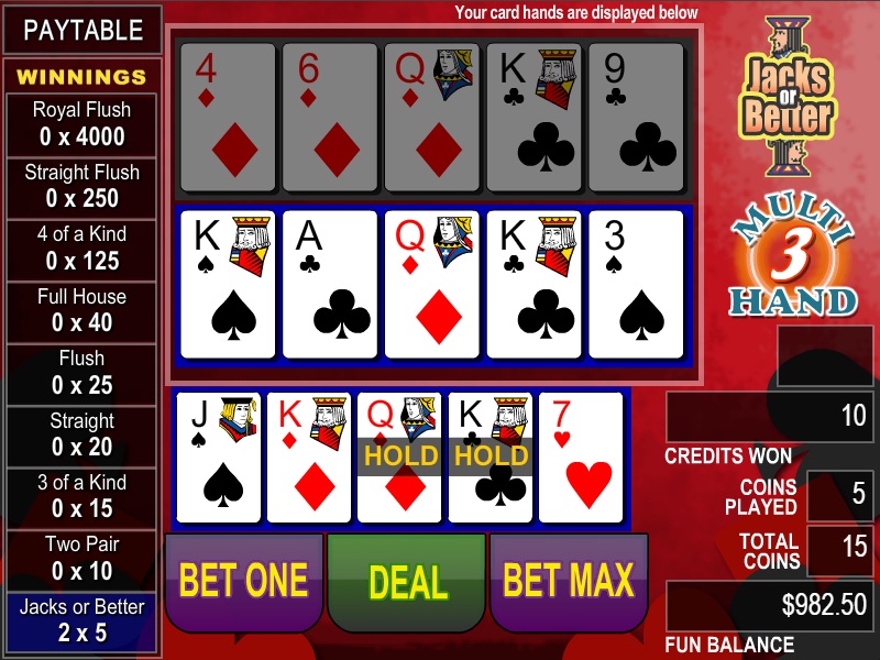 Nuworks で提供しているビデオ ポーカーは、この記事の執筆時点では 3 種類のゲームに限られています。3 つのゲームはすべてシングル プレイで利用でき、そのうち 2 つは 3 プレイでも利用できます。グラフィックスとサウンドは 90 年代後半のようです。コインが金属ホッパーに当たる音は、 Realtime Gamingで使用されているのと同じ効果音に非常によく似ています。