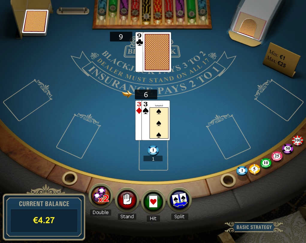 カバーされていない唯一の主要なルールは、再分割が許可されているかどうかです。インターネット カジノでは通常、6 組のカードがあり、再分割は許可されていないと仮定すると、ハウス エッジは 0.46% になります。