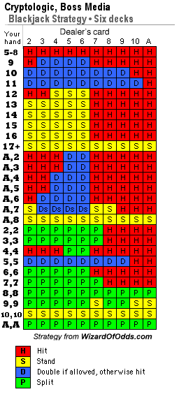 正しい基本戦略は、Cryptologic および Boss Media マルチプレイヤーの場合と同じです。次のようになります。10 を分割した後、ブラックジャックで 3-2 で勝ったとしても、プレイヤーは 10 を分割してはならないことに注意してください。