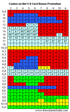 Casino on Netは、5枚以上のカードでバーストしていないハンドにボーナスが付与されるプロモーションを2回提供しました。ボーナスは5枚の場合は賭け金の半額、6枚の場合は賭け金と同額、7枚の場合は賭け金の5倍、8枚の場合は賭け金の50倍です。Casino on Netのスタッフによると、このルールはスプリット後のハンドにも適用されるとのことです。残念ながら、このプロモーションでは、ソフト21の場合はソフトウェアが自動的にスタンドします。プレイヤーがこのプロモーション用に設計された完璧な構成依存戦略を実行した場合、0.55%のエッジが得られます。