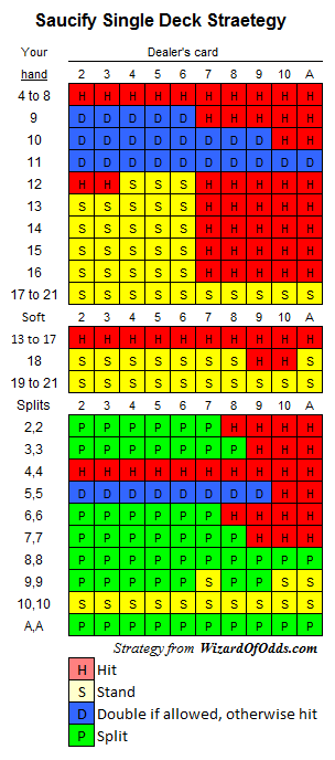 最も良いルールは「シングルデッキ」ゲームで、ハウスエッジは 0.23% です。このゲームの基本戦略は以下のとおりです。