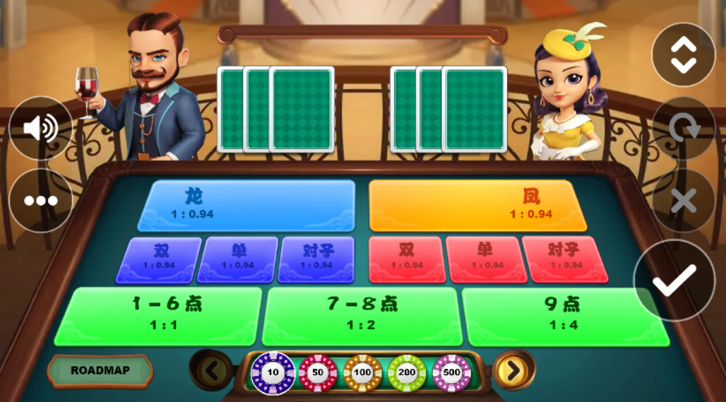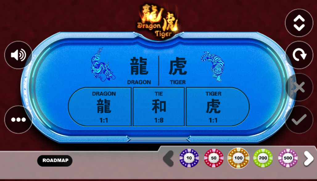 ドラゴン タイガーは、 2 枚のカードのみを使用するシンプルなゲームで、プレイヤーはドラゴンかタイガーのどちらが強いか、または引き分けかを予想します。8 つのデッキを使用します。引き分けの場合は、通常の 8 対 1 のけちなオッズが支払われます。各ベットのハウス エッジは次のとおりです。