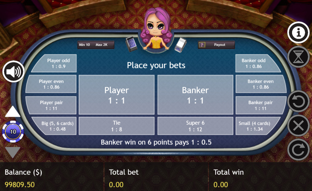 バカラ ゲームは標準ルールに従ってプレイされ、バンカー ベットが勝った場合の配当は 0.95 です。サイド ベットはいくつかありますが、これらは以下のスーパー 6 セクションのものとまったく同じです。要するに、唯一の違いは、バンカー ベットのハウス エッジが 1.06% であるのに対し、スーパー 6 では 1.46% であり、スーパー 6 サイド ベットがないことです。