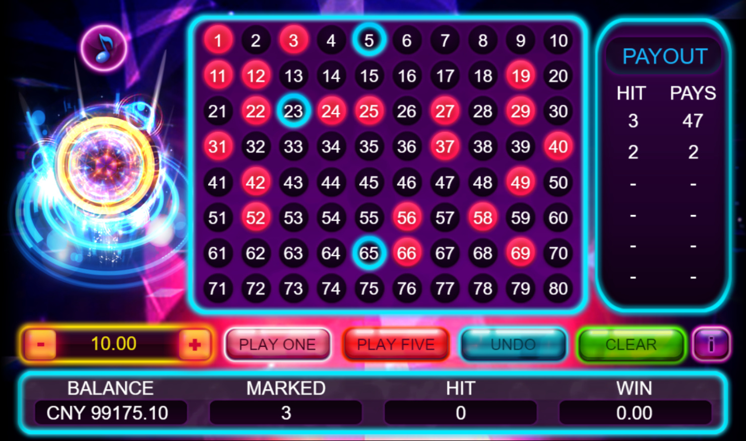 Triple PG は、このキノ ゲームを Neon Keno と呼んでいます。これは、私が今まで見た中で最も速いキノ ゲームかもしれません。このゲームでは、ビンから 20 個のボールを取り出すのではなく、カード上の 20 個の数字にレーザーを照射します。ただし、計算は同じです。