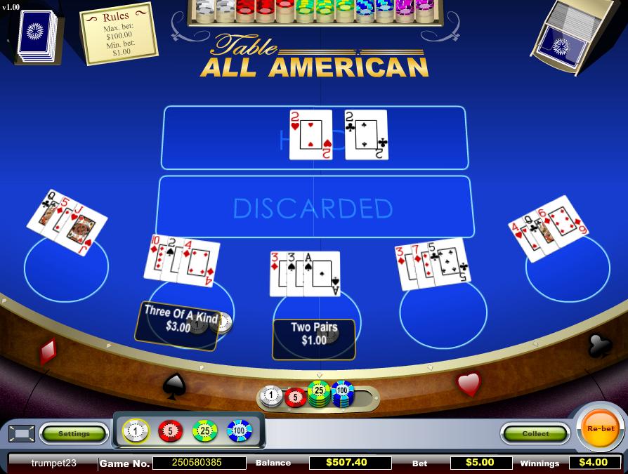 これは、ビデオ ポーカー ゲームAll Americanのテーブル ゲーム バージョンです。プレーヤーは 1 ~ 5 つのベッティング スポットでプレイできます。Vista はビデオ ポーカー ゲームと同じペイ テーブルに従いますが、ロイヤル フラッシュは 1 コイン ベットにつき 800 ではなく 250 を支払います。これにより、ハウス エッジが 96.27% から 95.12% に下がります。