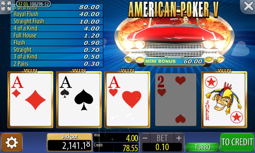 - American Poker Gold、American Poker V、Joker Poker — これらのゲームはすべて、ジョーカーを含む 53 枚のカード デッキを使用し、私ができる限り、プレーヤーがディールとドローの両方の料金を支払うというドイツのルールに従いますが、支払いは最後のハンドに対してのみ行われます。Joker Poker (ドイツのルール)のページで、3 つのゲームすべてを分析しています。カードが公平に配られていると仮定すると、最初のハンドごとにプレーヤーに 16% のアドバンテージが見られますが、実際にはそうではないと思われます。