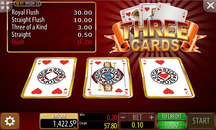 - スリーカード — 配って引き分けるというドイツのルールを採用したゲームです。このゲームが他と異なるのは、カードが 3 枚しかないことです。52 枚のカード デッキを使用します。このゲームの分析は可能ですが、American Poker Gold、American Poker V、Joker Poker、Turbo Poker を分析した後、気分転換に通常のゲームを分析してみたいと思います。