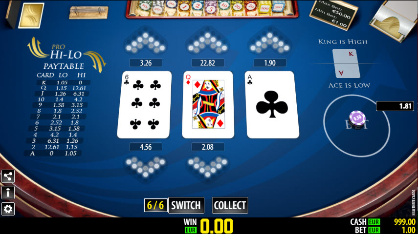 Hi Lo は、ランダムに選ばれたカードが表向きのカードより高いか低いかを予測するシンプルなゲームです。このゲームの他のプレゼンテーションとは異なり、WM では、プレーヤーは 3 枚の表向きのカードの中から賭けるものを選択できます。次の表は、利用可能なすべての賭けに対する配当表、勝利の確率、および期待されるリターンを示しています。
